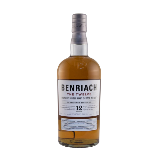 O Benriach 12 anos é um malte single Speyside maduro num trio de barris - nomeadamente barris de xerez, barris de bourbon e barris de porto! Esta maturação tem transmitido notas de frutos secos em abundância, ao lado de wafts de bom café e especiarias subtis.